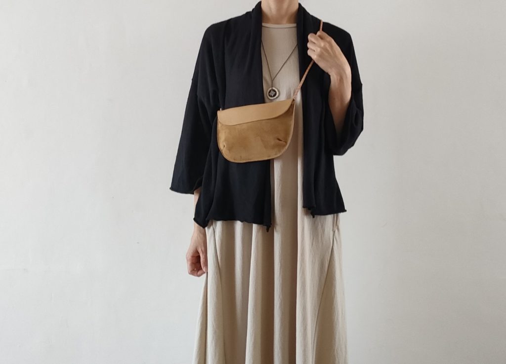 小さいフラップがついた、短い紐のサコッシュは、やわらかく身体に沿うから
