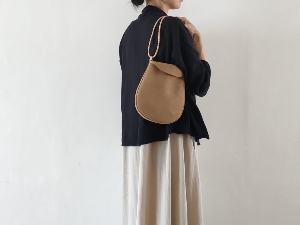 小さいフラップをふわりとかぶせた、まるい楕円形のかたち。