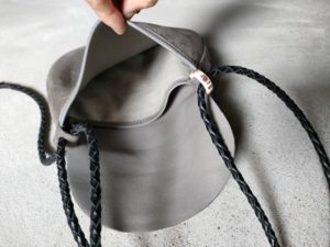 サイドの細いマチから続くループと鹿の角リングに、細い紐を通して結んで、