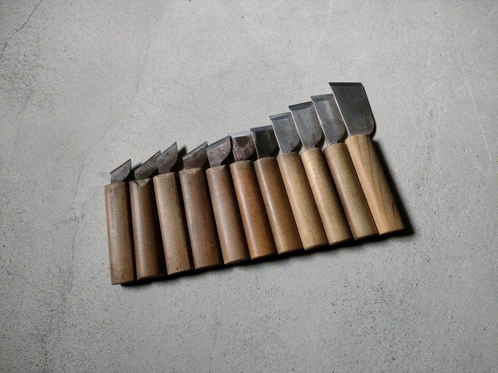 ↑ クニヨシの研ぎながら使ってきた歴代の革包丁