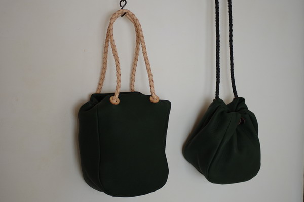 鹿革の深緑は、巾着とパッチワークポーチでご紹介。