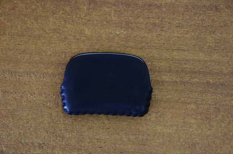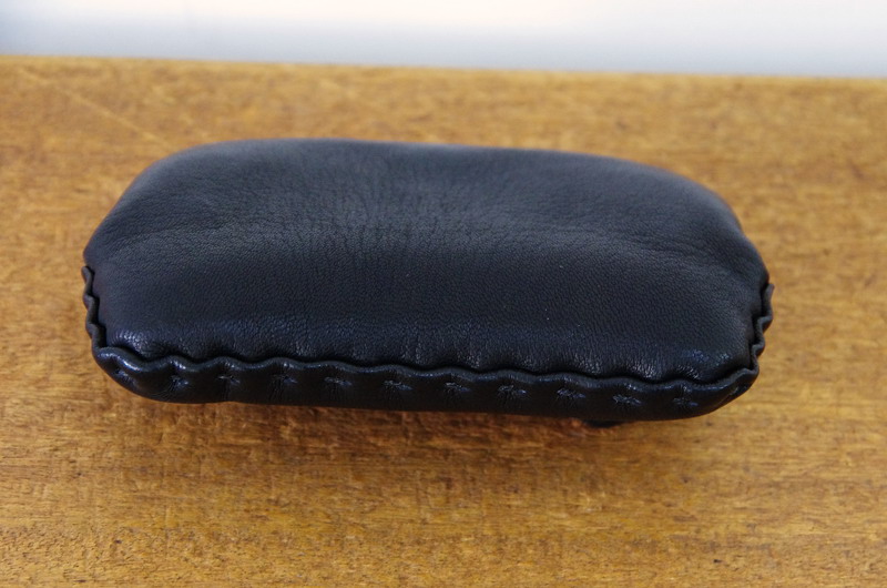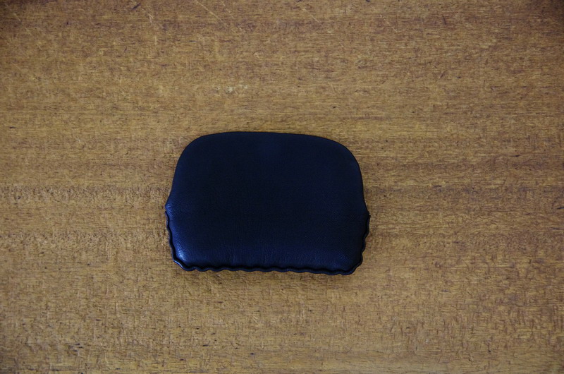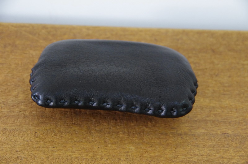 裏表で貼り合わせた鹿革を使い、底部分はハンドステッチで仕上げ、底の重なり部分でふくらみを出しています。