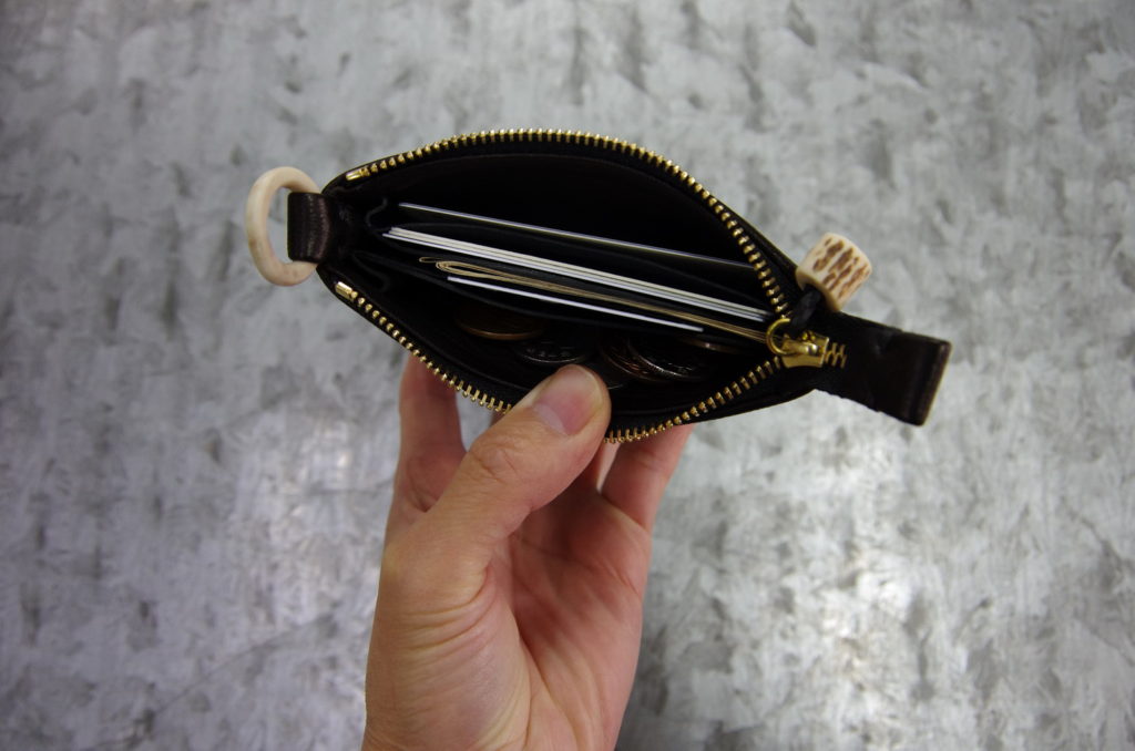 これは、鹿革の柔らかさと細いマチによる厚みがポイントで、財布としての役割に加えて、