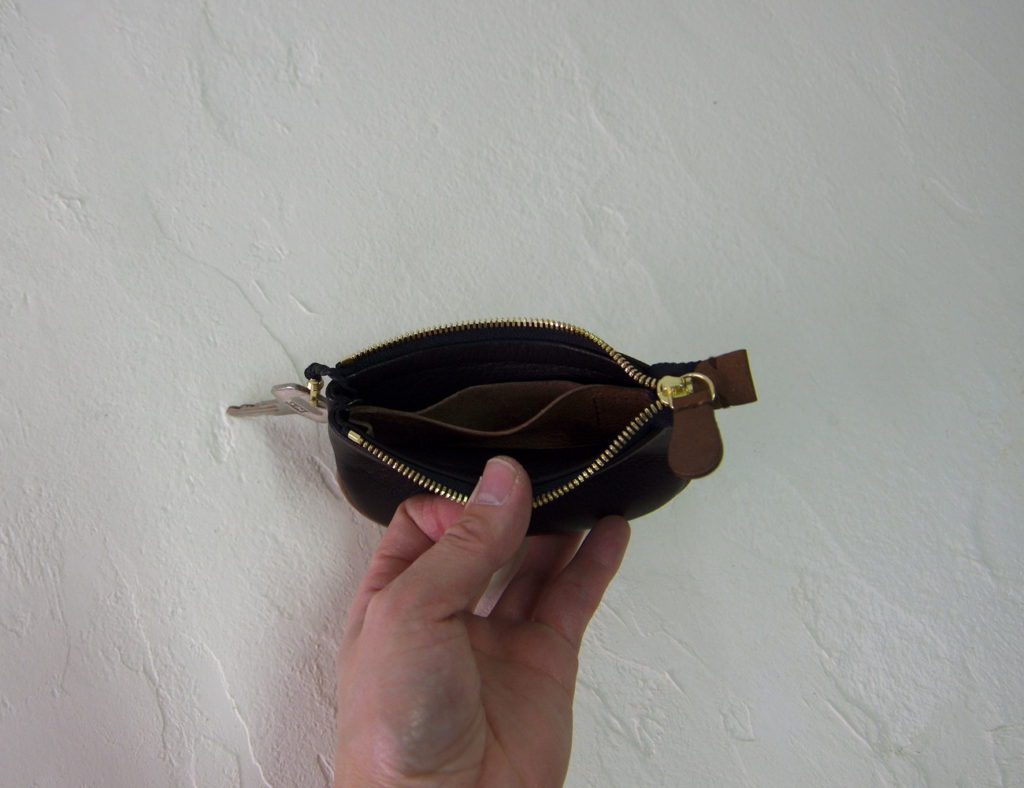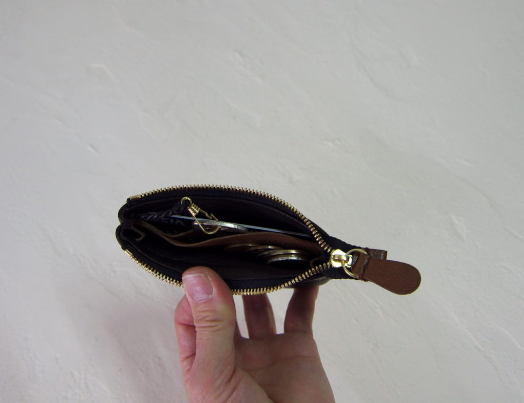鍵は外に出してファスナーを閉めても使えますし、コインケースに取り付けたホルダーに差し込んで収納することもできます。