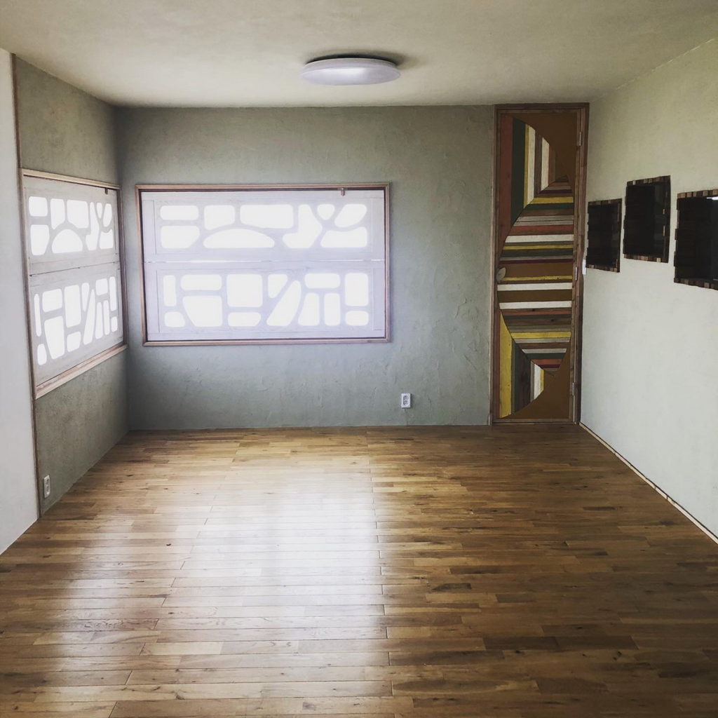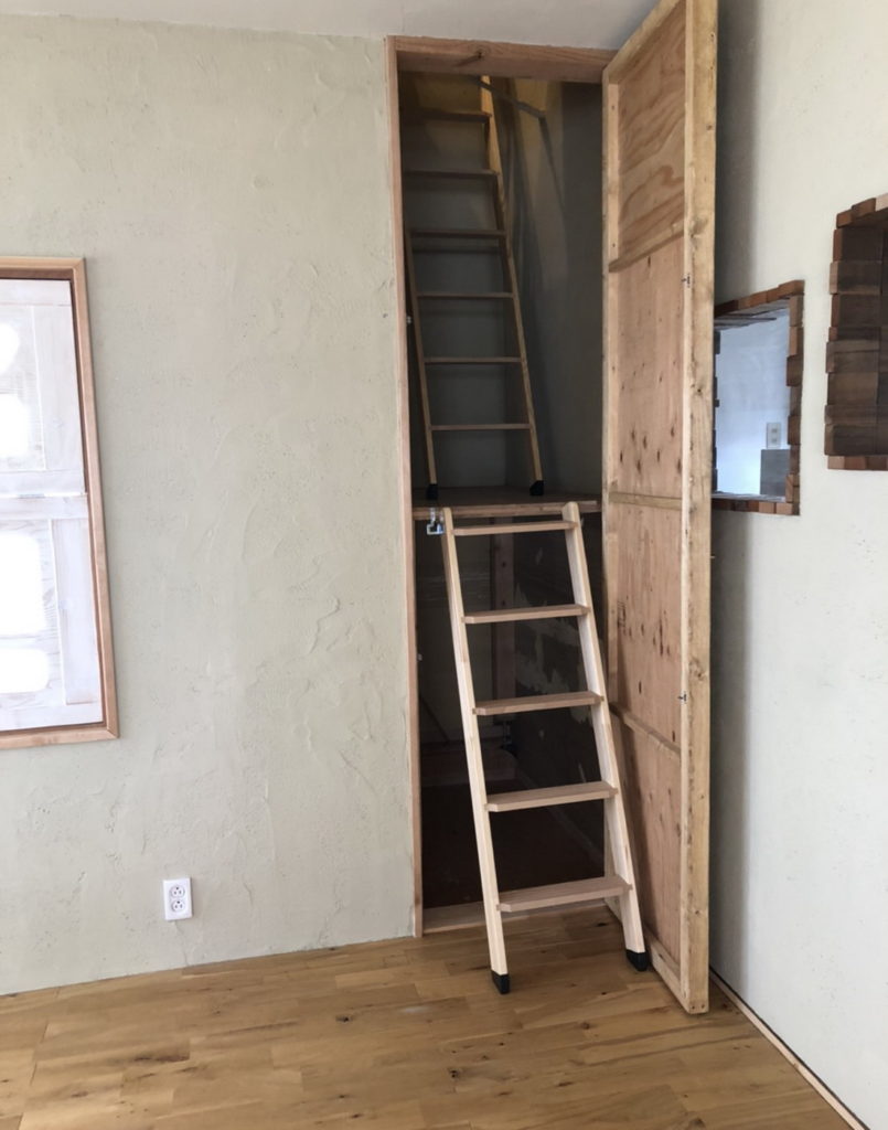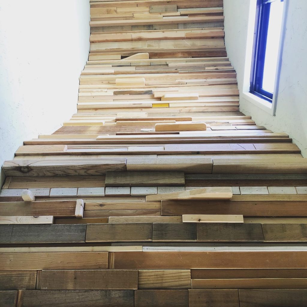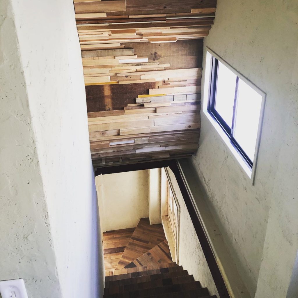 ごく薄く緑を含んだ白い左官の天井、木っ端を積木のように寄せ集めたふぞろいの寄木天井に階段と窓枠、