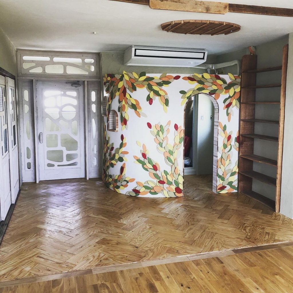 色とりどりの葉っぱがツタのように絡まる壁の小さいアーチ状出入口に飾り棚・・・
