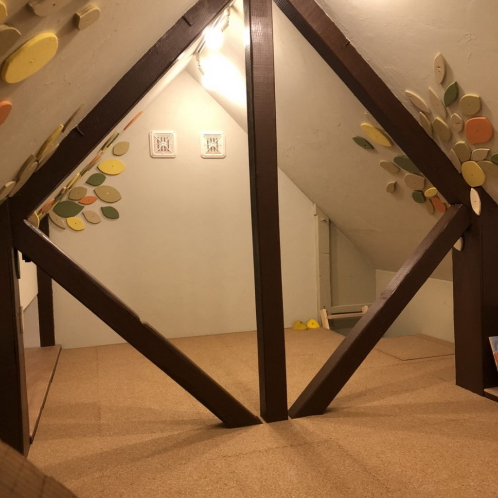 本やマンガが並んだ屋根裏があります。(秘密基地で昼寝も)