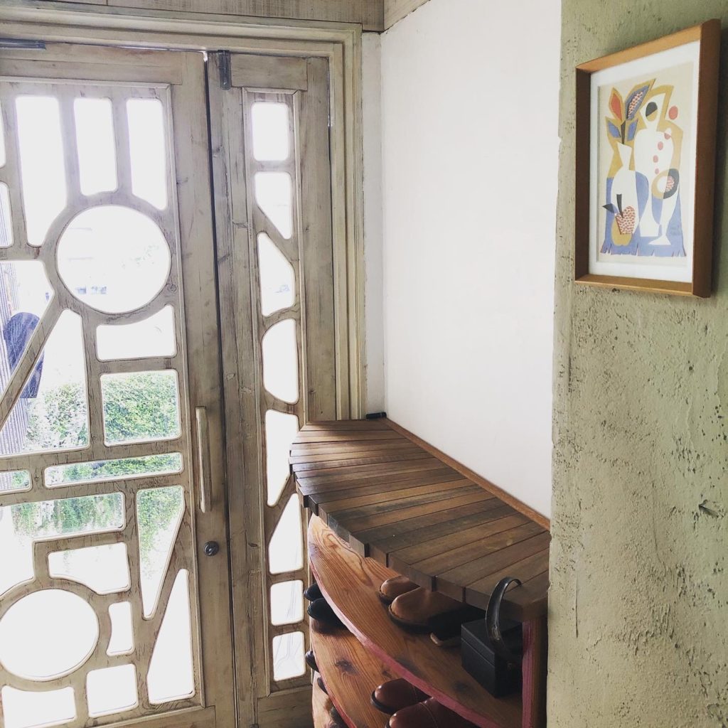 外壁はモルタル左官、ガラスが印象的なイギリスのアンティークドアはアッシュホワイトに塗り替えて。