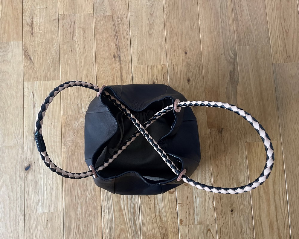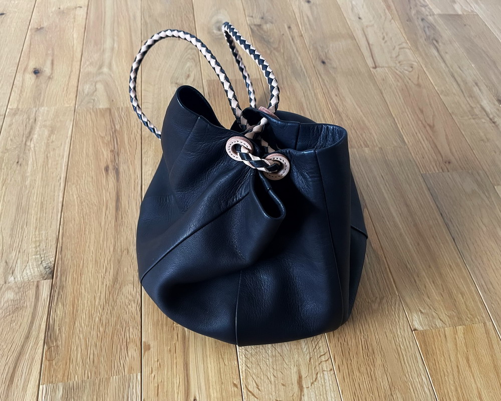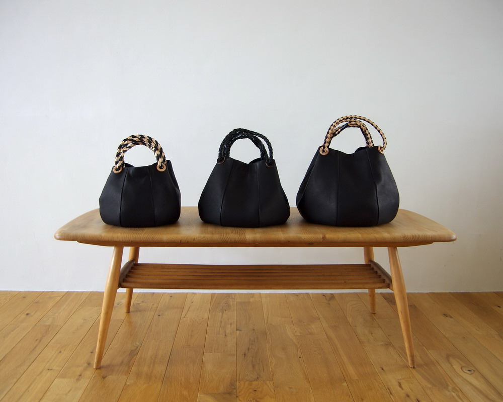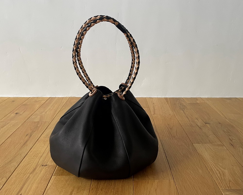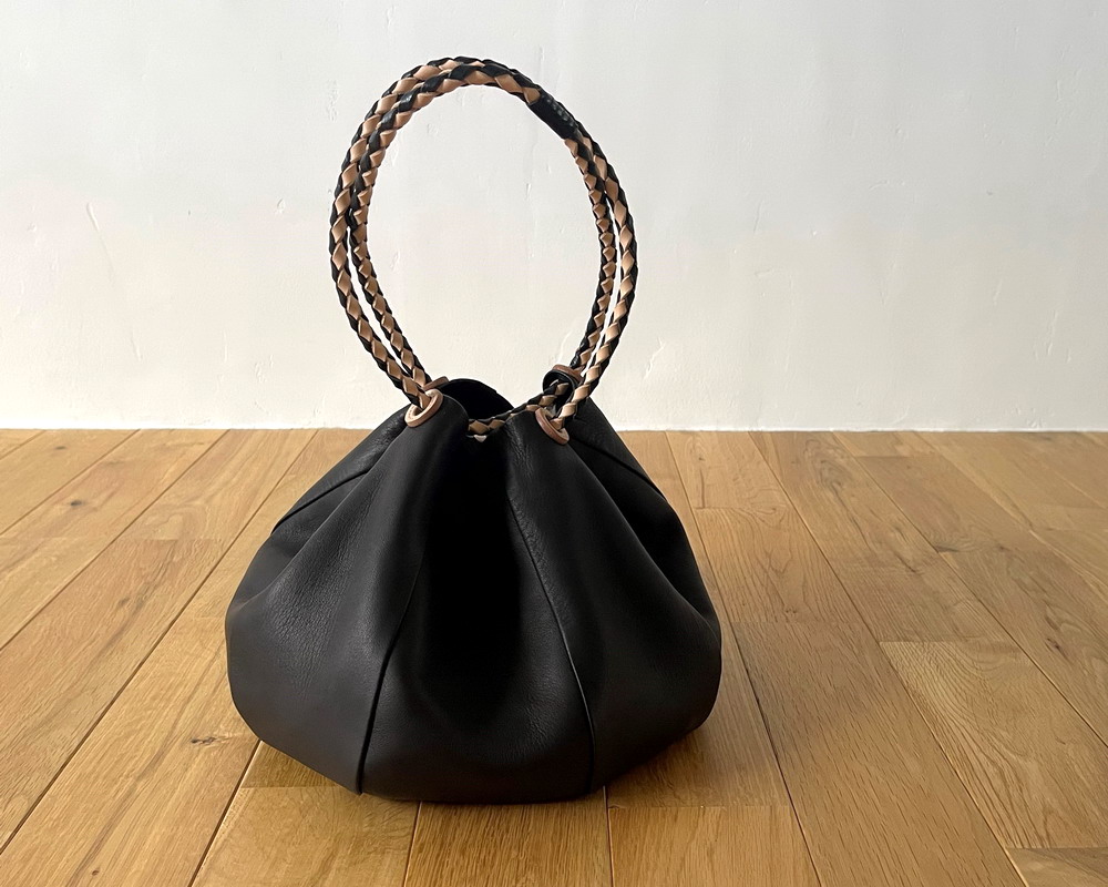 じゃあハンドルはどうするか、バッグ口の開閉はどうするのか、ファスナーや金具や何かパーツを使うのか、かたちや大きさのバランスはどうなのか、話し合いながら試行錯誤の時間を経て、結局は巾着型が最適なんだろうとの結論に至りました。