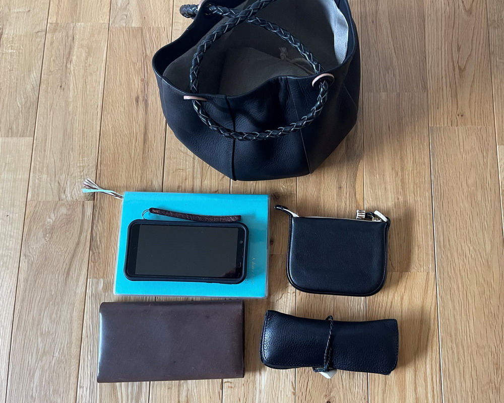 19cm幅長財布、A5手帳、小さいポーチ、スマートフォン、眼鏡