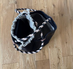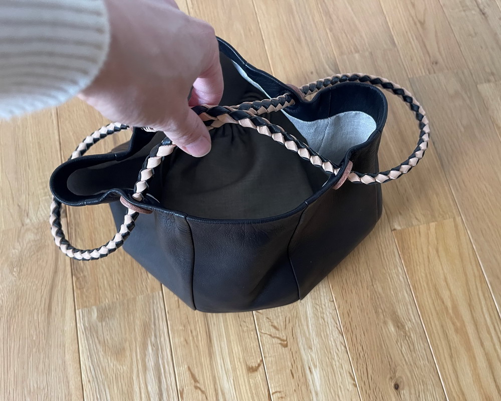 そのままバッグのサイド部分に通っている部分の紐も一緒に持ち上げるとハンドルは短くなり手持ちのトートバッグになります。(口部分の両サイドのひだを内側にたたむと ↓ この形状です)