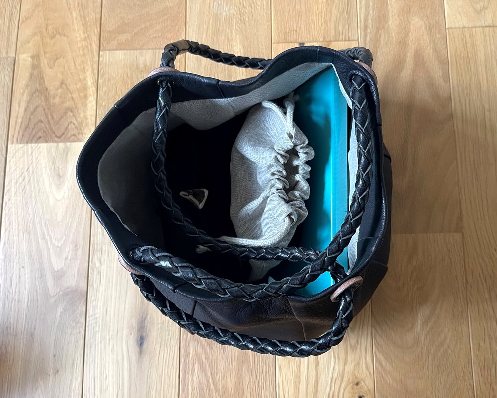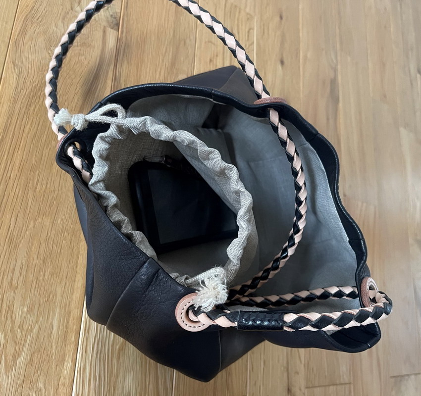 裏地の底に縫い留めているリネンの巾着袋の大きさは、