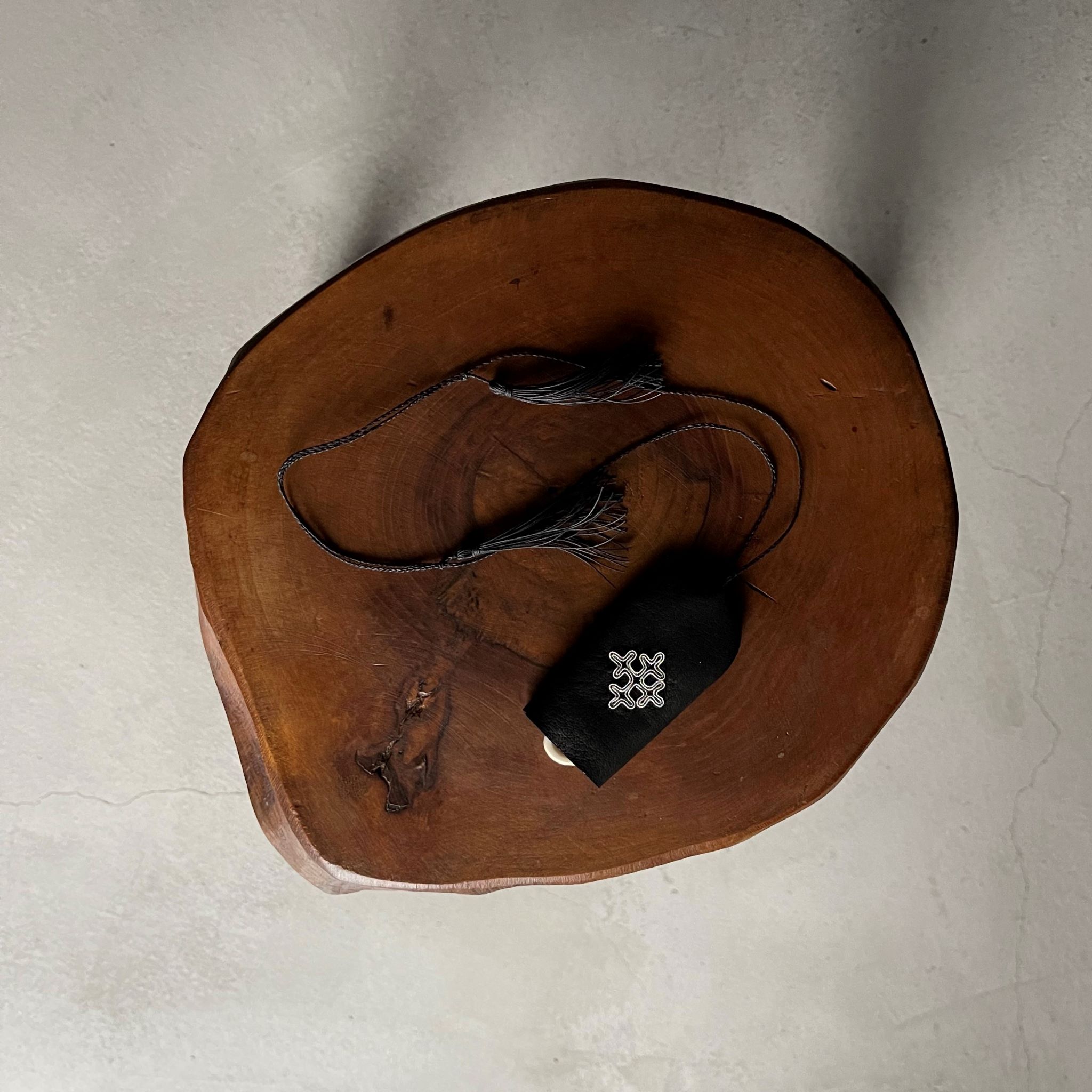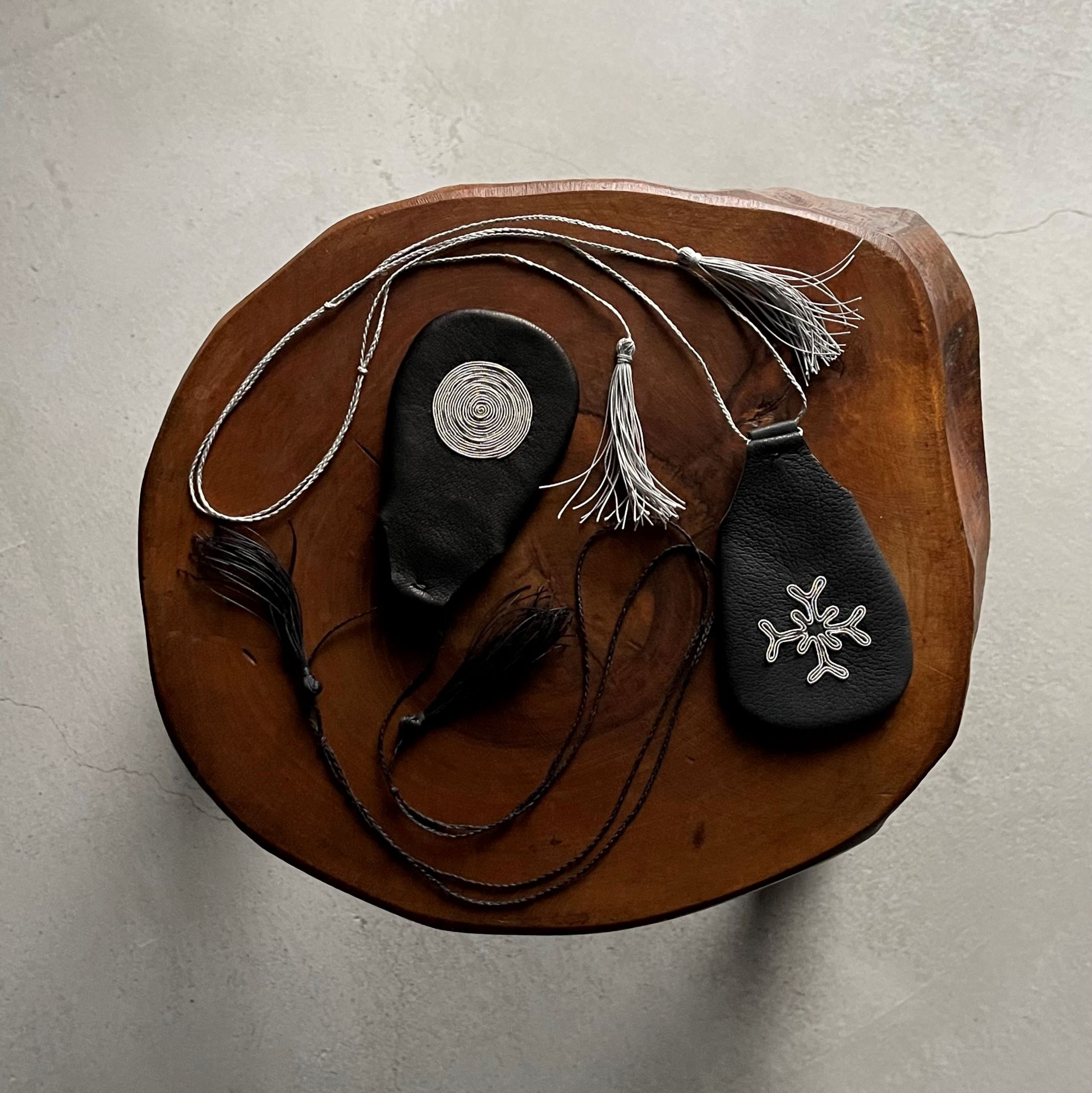 本体前面の刺繍の後、途中工程(革の貼り合わせ、縫製)は休憩中などにヌイトメルが行い、紐を編んで仕上げた製品をお持ち帰りいただきます。