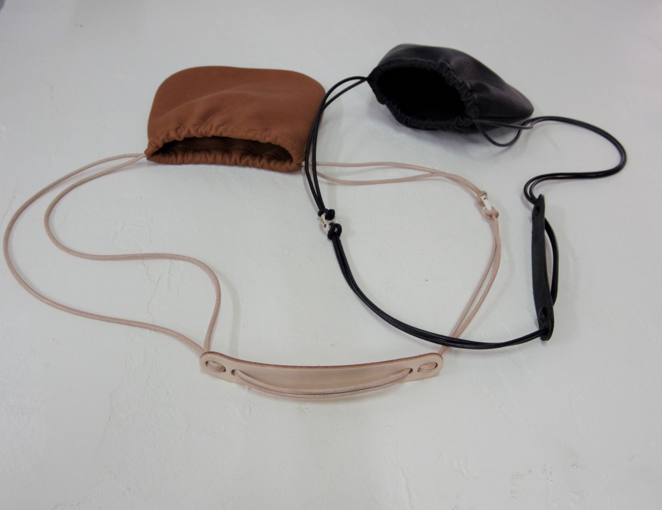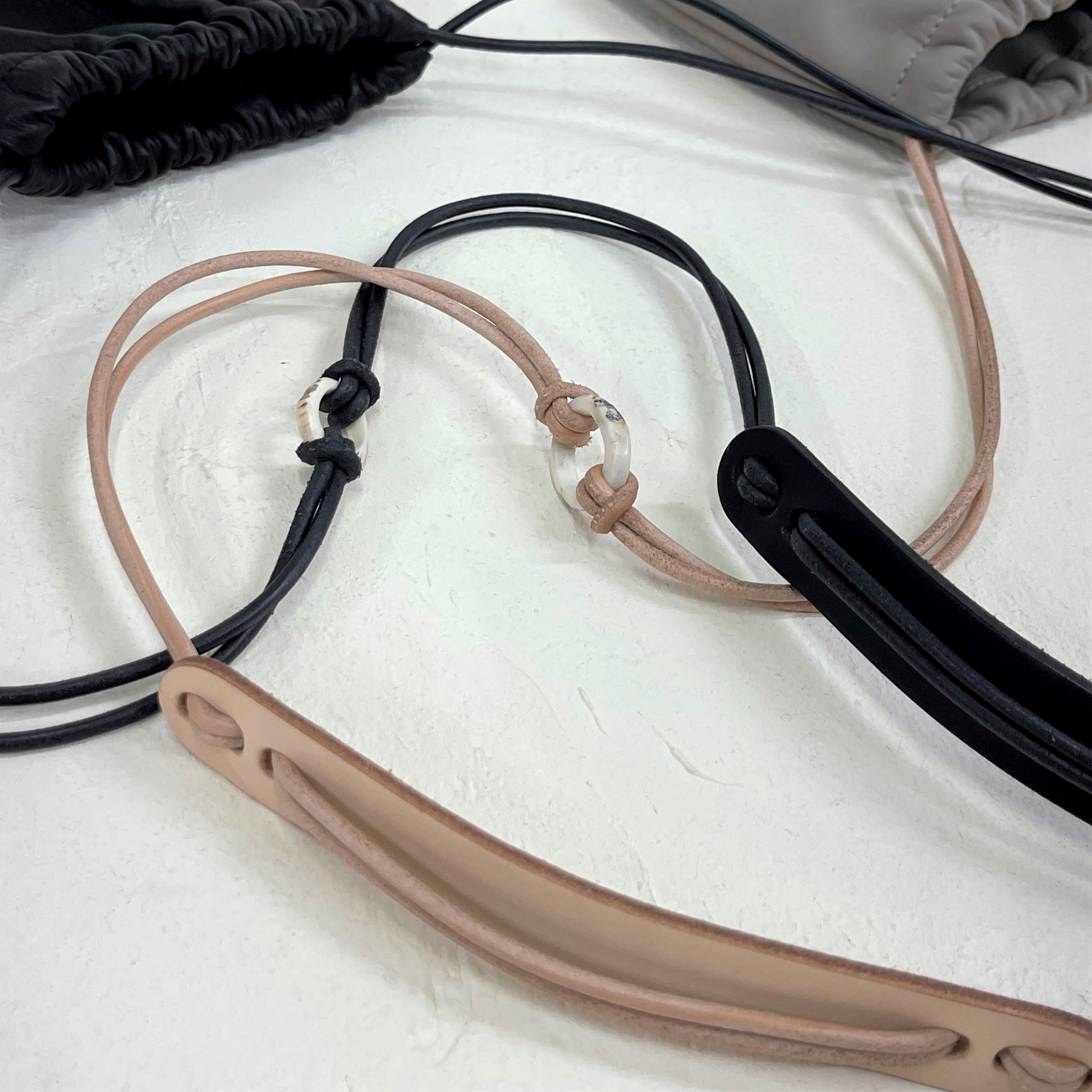 細い革の丸紐で滑り良く、肩当てパットの革プレートで紐を束ねる。
