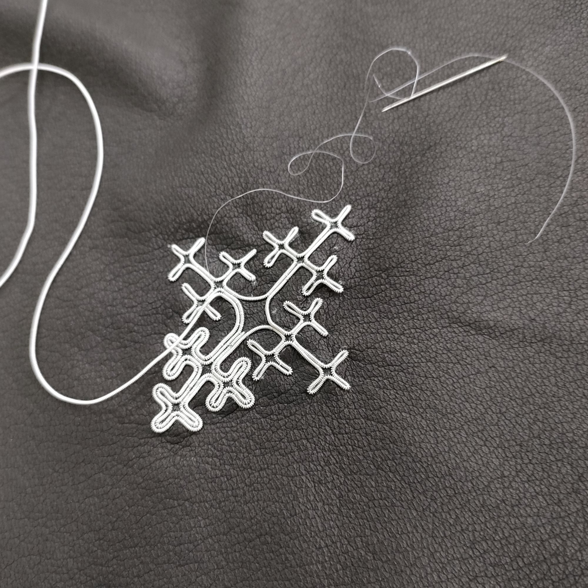 ピューターワイヤーでクロスモチーフを刺繍した小さなバッグを