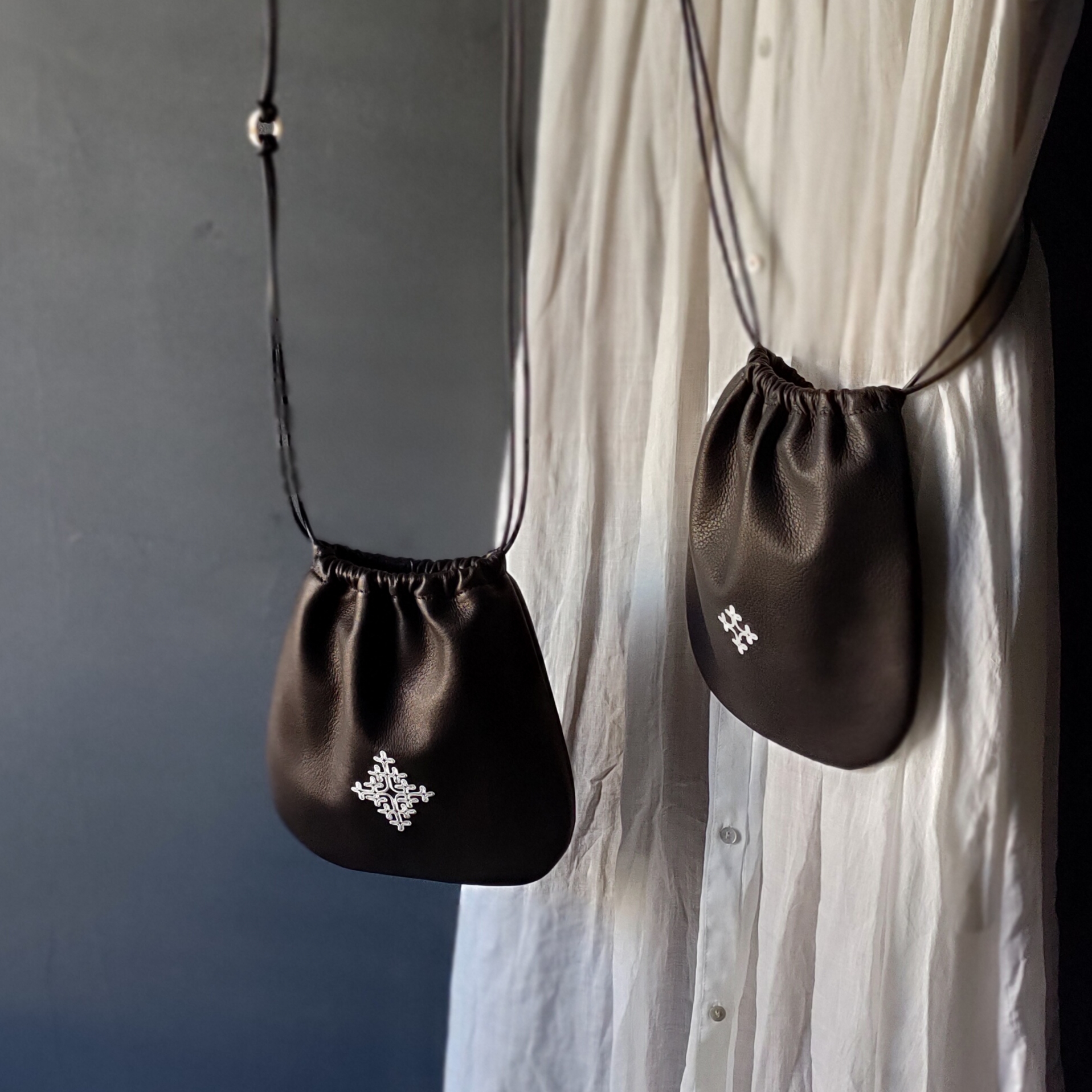 鹿革と鹿ツノのポシェットには、ピューターワイヤーの手刺繍を施すタイプも。