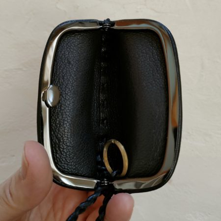 | 商品内容 | 艶やかな山羊革の押口ポーチ。鹿革の革紐に取り付けたキーリングに鍵を付けます。 表革を貼り合わせているので内側も 山羊革で、底は手縫いによりふっくらした立体に。口金のふちを持って中の留め具を押して開ける押口金具ですっきりとしたカタチです。 ※鍵を入れすぎると口金が破損する恐れがあります。 |